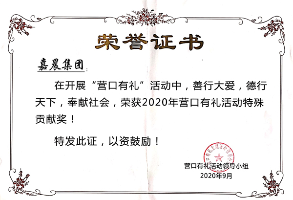 嘉晨集團(tuán)作為國(guó)家大型企業(yè)集團(tuán),在注重企業(yè)發(fā)展壯大的同時(shí),不忘回報(bào)社會(huì),反哺家鄉(xiāng),董事長(zhǎng)他始終不忘“家國(guó)人”的“思源”、堅(jiān)守“社會(huì)人”的“思報(bào)”,一直不負(fù)社會(huì)和國(guó)家的重托。多年來(lái),一直以踐行社會(huì)責(zé)任為己任,在汶川地震、玉樹(shù)地震等國(guó)家為難時(shí)刻,都曾第一時(shí)間做出響應(yīng),通過(guò)捐款捐物等方式義不容辭地履行社會(huì)責(zé)任。2019年,營(yíng)口市委為營(yíng)造全社會(huì)知禮、懂禮、守禮、行禮的良好氛圍,開(kāi)展“雷鋒文化 營(yíng)口有禮”的主題活動(dòng),嘉晨集團(tuán)捐款590萬(wàn)元;為打造“營(yíng)口名片”,冠名“營(yíng)口號(hào)”高鐵列車(chē)贊助600萬(wàn)元;今年的新冠肺炎疫情期間共計(jì)捐款530萬(wàn)元,支持當(dāng)?shù)卣蜈A這場(chǎng)抗“疫”攻堅(jiān)戰(zhàn)。在營(yíng)口援鄂醫(yī)療隊(duì)勝利返營(yíng)后,又向戰(zhàn)“疫"先鋒們捐款100萬(wàn),獎(jiǎng)勵(lì)她們的英雄壯舉!今天再次向“營(yíng)口有禮”基金捐贈(zèng)500萬(wàn)元,為營(yíng)口有禮活動(dòng)提供持續(xù)動(dòng)力!